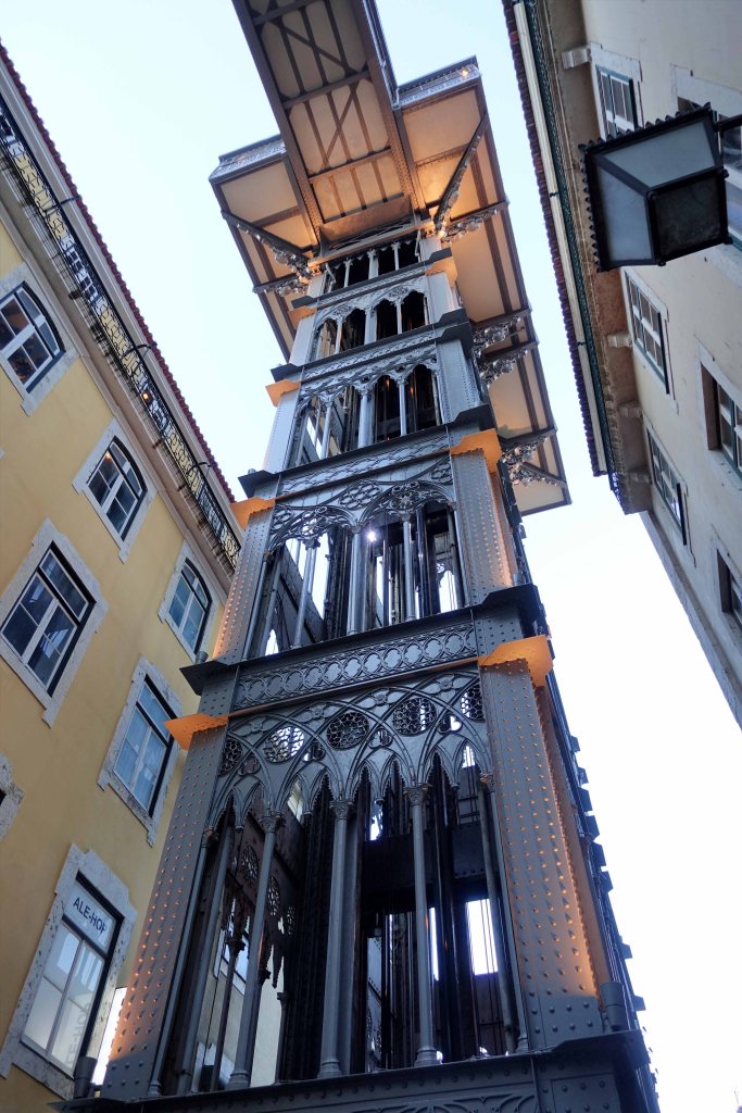We reached the famous Elevator De Santa Justa, this is a 19th century lift that transports passengers up the steep hill from the Baixa district to the Largo do Carmo. The lift dates from an era when wrought-iron was both a construction material and art form, and the structure is adorned with glorious neo-gothic arches and geometric patterns, while inside two sumptuous polished wood carriages whisk passengers up in style.
