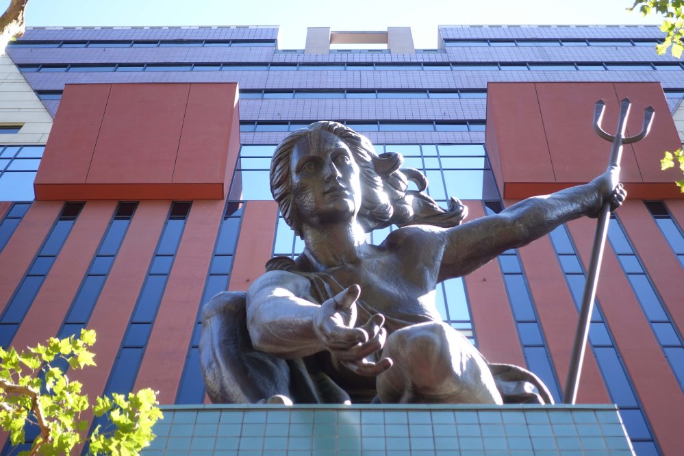 The statue is based on the design of the city seal. It depicts a woman dressed in classical clothes, holding a trident in the left hand and reaching down with the right hand.