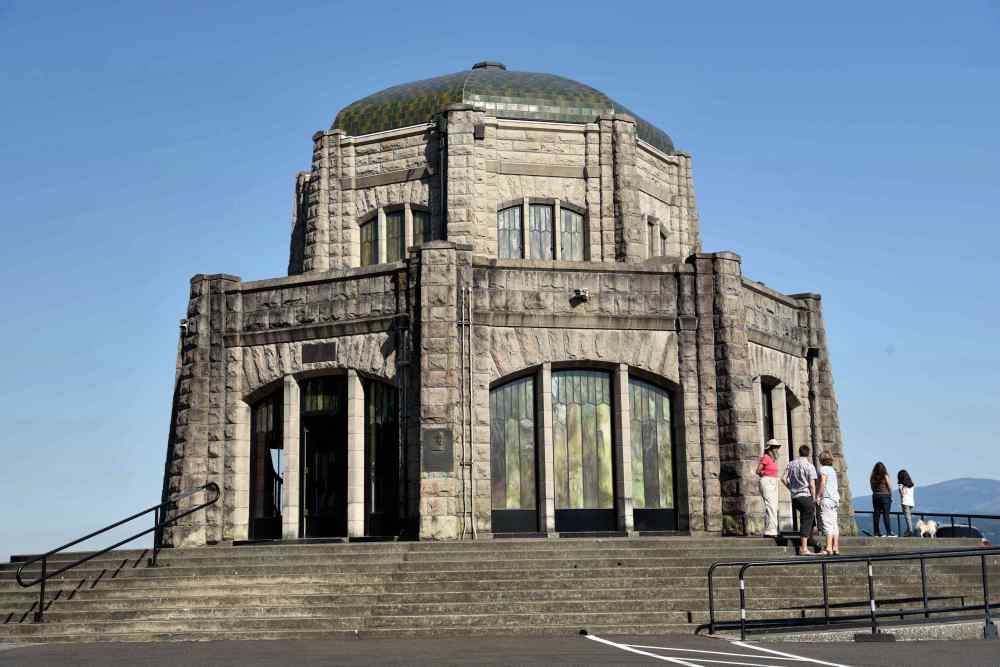 The site, on a rocky promontory, is 733 feet (223 m) above the Columbia River on the south side of the Columbia River Gorge.
