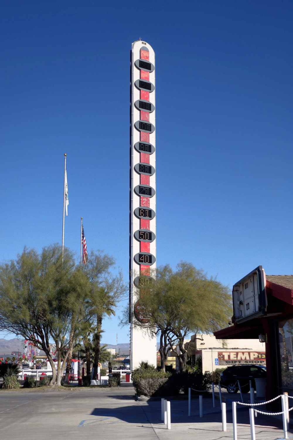 Willis Herron, a businessman, dreamed of a huge thermometer for 25 years before he made it real in California’s high desert. The World’s Tallest Thermometer is a 134-foot-tall symbol of the record high temperature in the U.S., in nearby Death Valley — 134 degrees Fahrenheit in 1913.