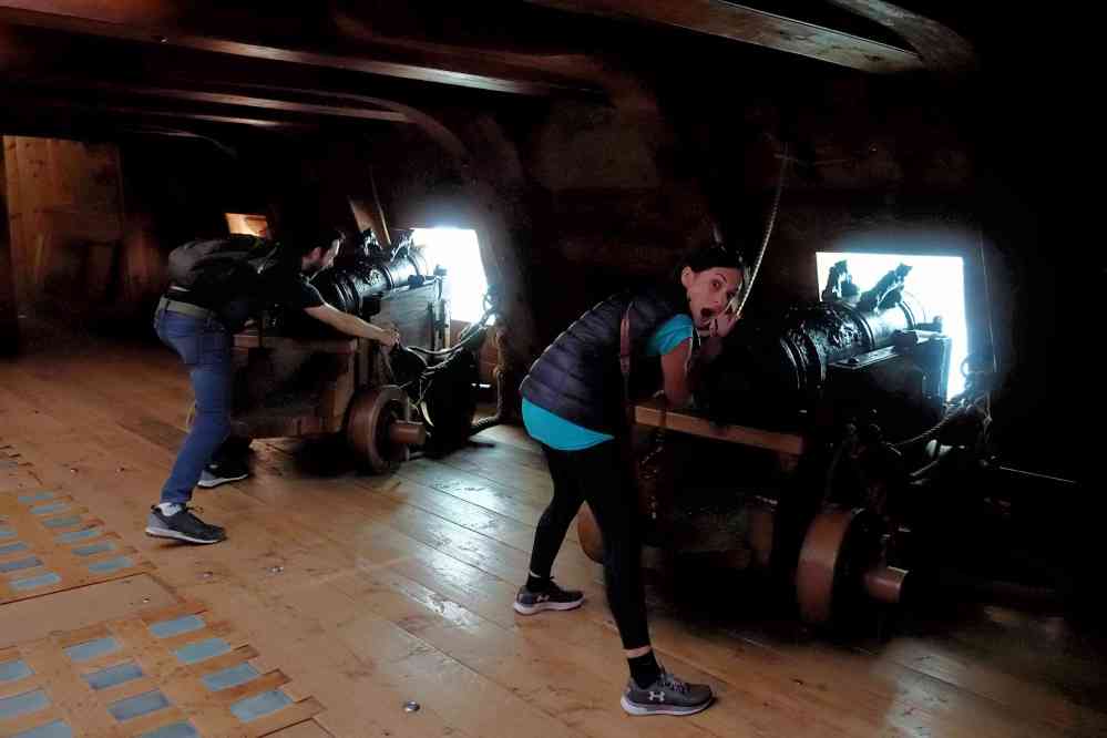 Becasue they don’t let you walk inside the ship (for good reason), they have a reconstructed identical cannon deck where you can see how it looked. I taught Sarah the art of maritime warfare. This is us practicing our cannon skills….