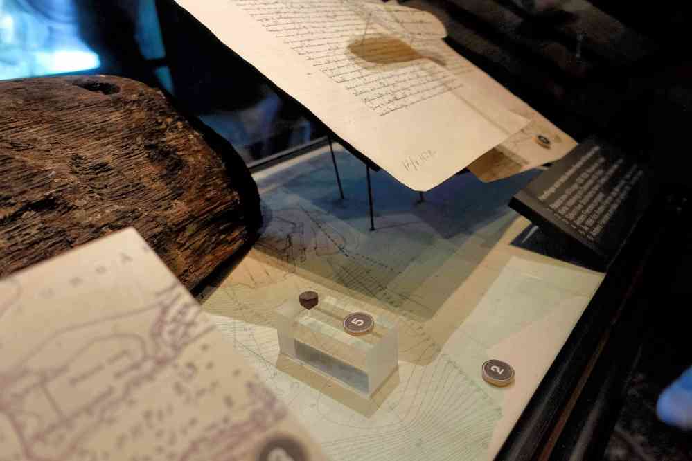 During the 1961 recovery, thousands of artifacts and the remains of at least 15 people were found in and around the Vasa’s hull by marine archaeologists. Among the many items found were clothing, weapons, cannons, tools, coins, cutlery, food, drink and six of the ten sails. On the photo below, the number 5 item is the first piece of wood from the Vasa that was taken to validate that the ship has been found.