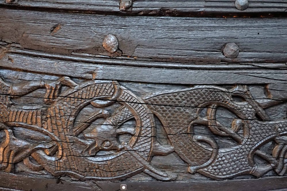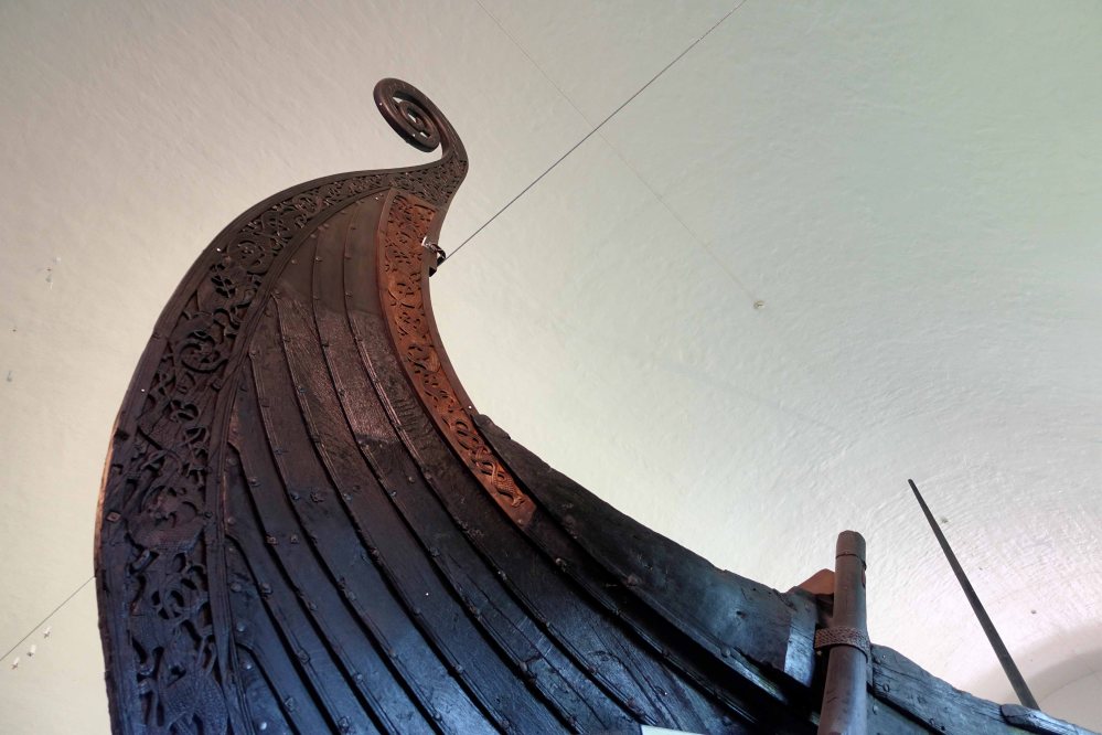 The bow and stern of the ship are elaborately decorated with complex woodcarvings in the characteristic “gripping beast” style, also known as the Oseberg style.