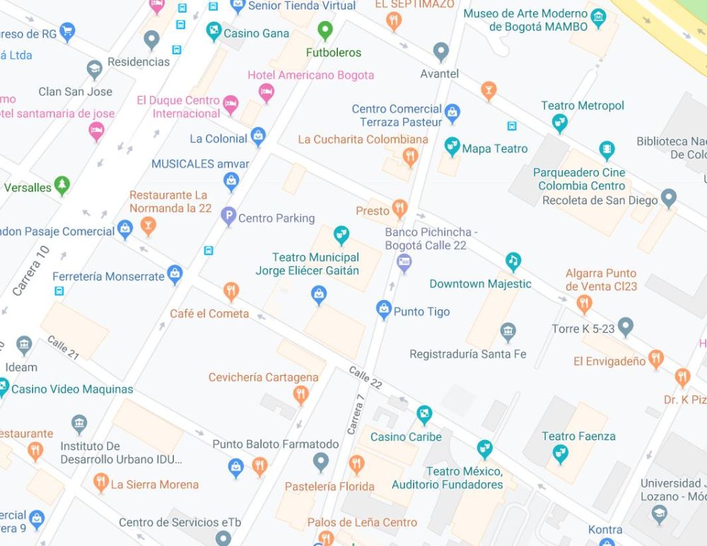 Bogota streets have no names, they have numbers. It is very easy to locate a place without a map. (The streets from south to north are called CARRERAS and those from east to west are called CALLES. And the diagonals streets to them are called transversales and DIAGONALES. The addresses are given as follows: CRR 11#90-17 (someone who leaves at the street CARRERA 11, on the corner with CALLE 90, and 17 is the number of the block) or CALLE 90#11-17 (someone who lives at the street CALLE 90 on the corner with CARRERA 11 and 17 is the number of the block). Complicated, right?
