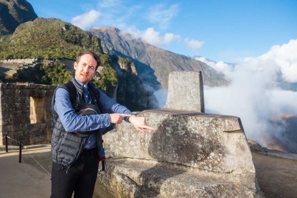 The Inca believed the stone held the sun in its place along its annual path in the sky. The stone is situated at 13°9’48” S. At midday on 11 November and 30 January, the sun stands almost exactly above the pillar, casting no shadow. On 21 June, the stone casts the longest shadow on its southern side, and on 21 December a much shorter shadow on its northern side. In this photo, the stone was casting the famous “Thomas shade”, which represents good travels Karma.