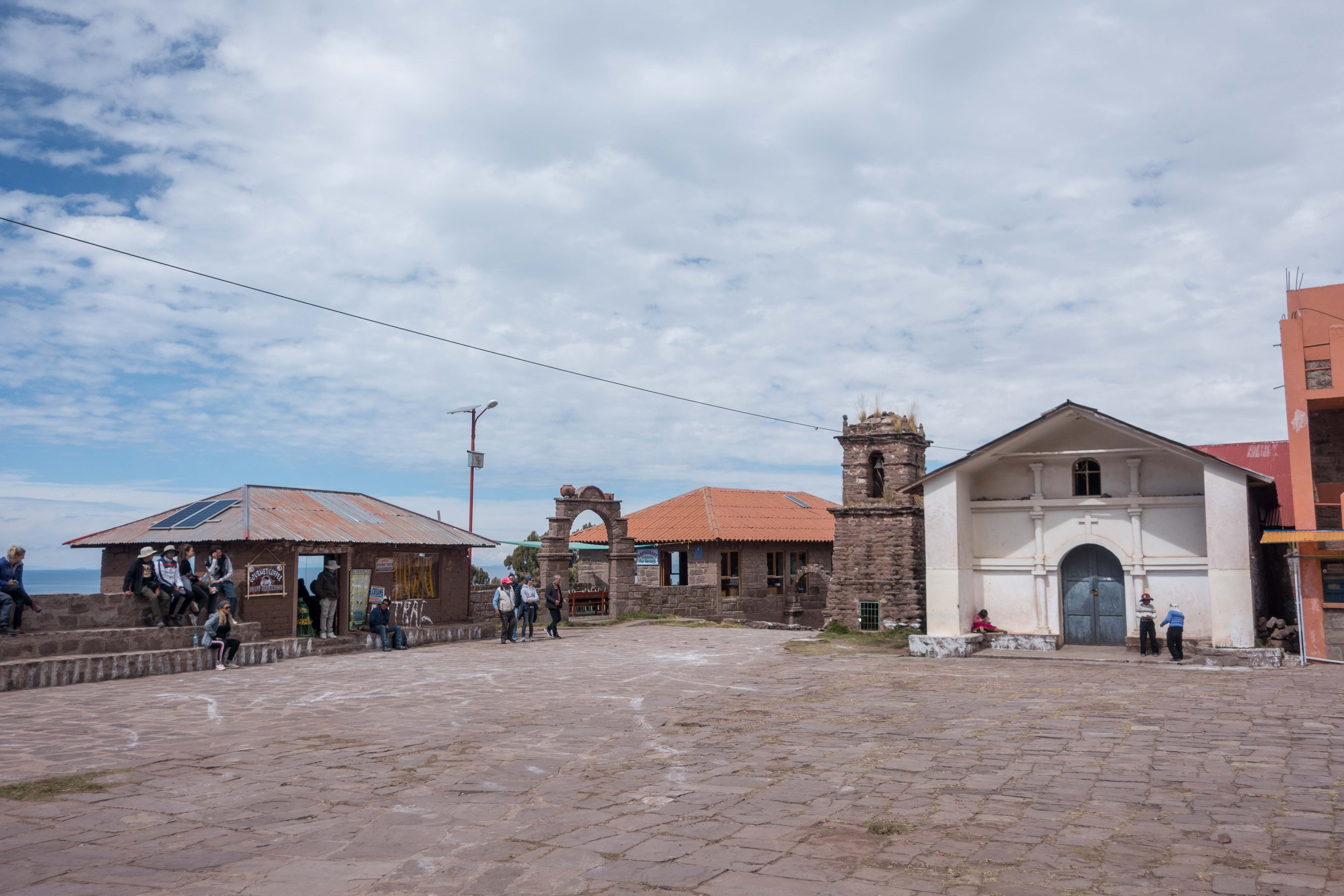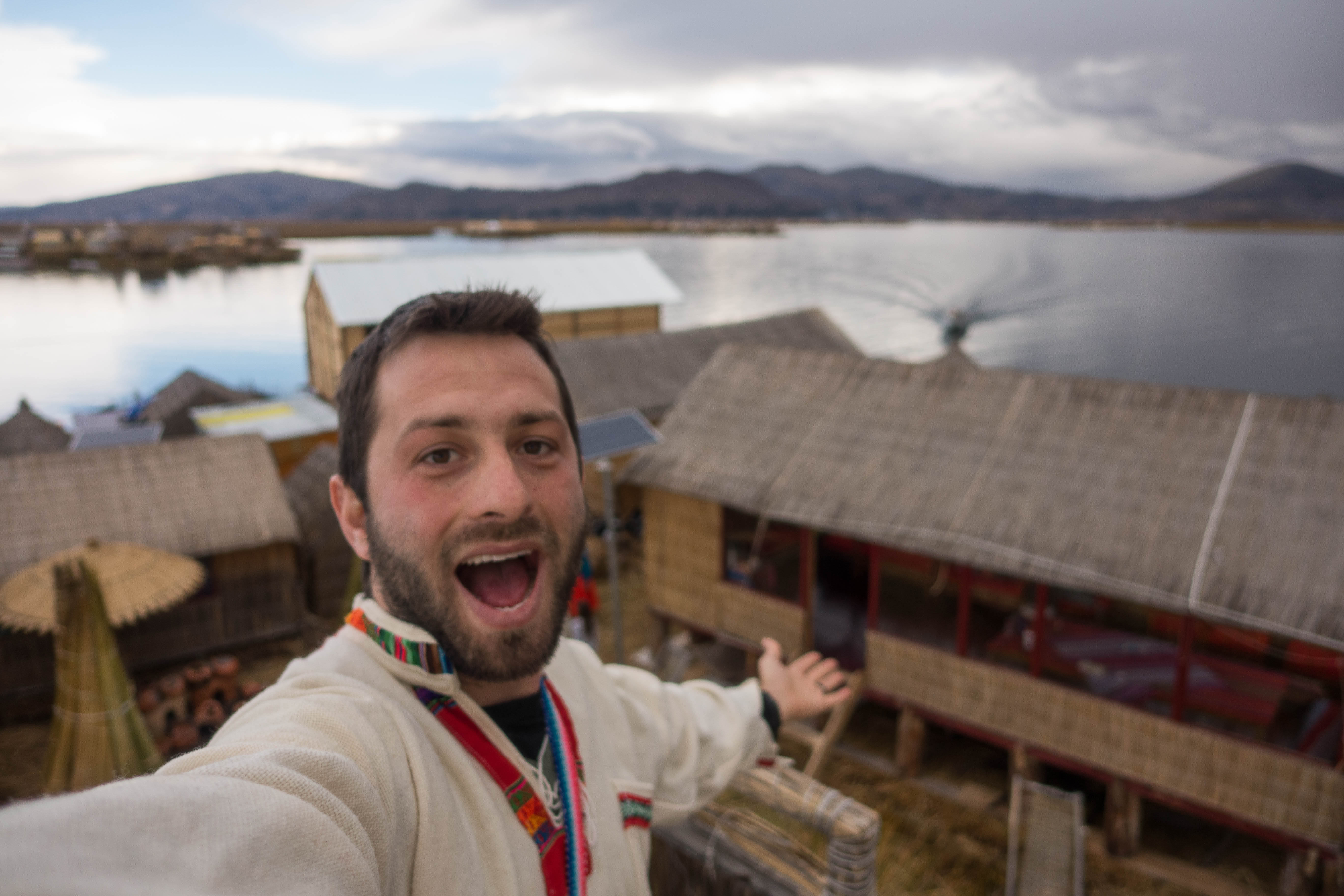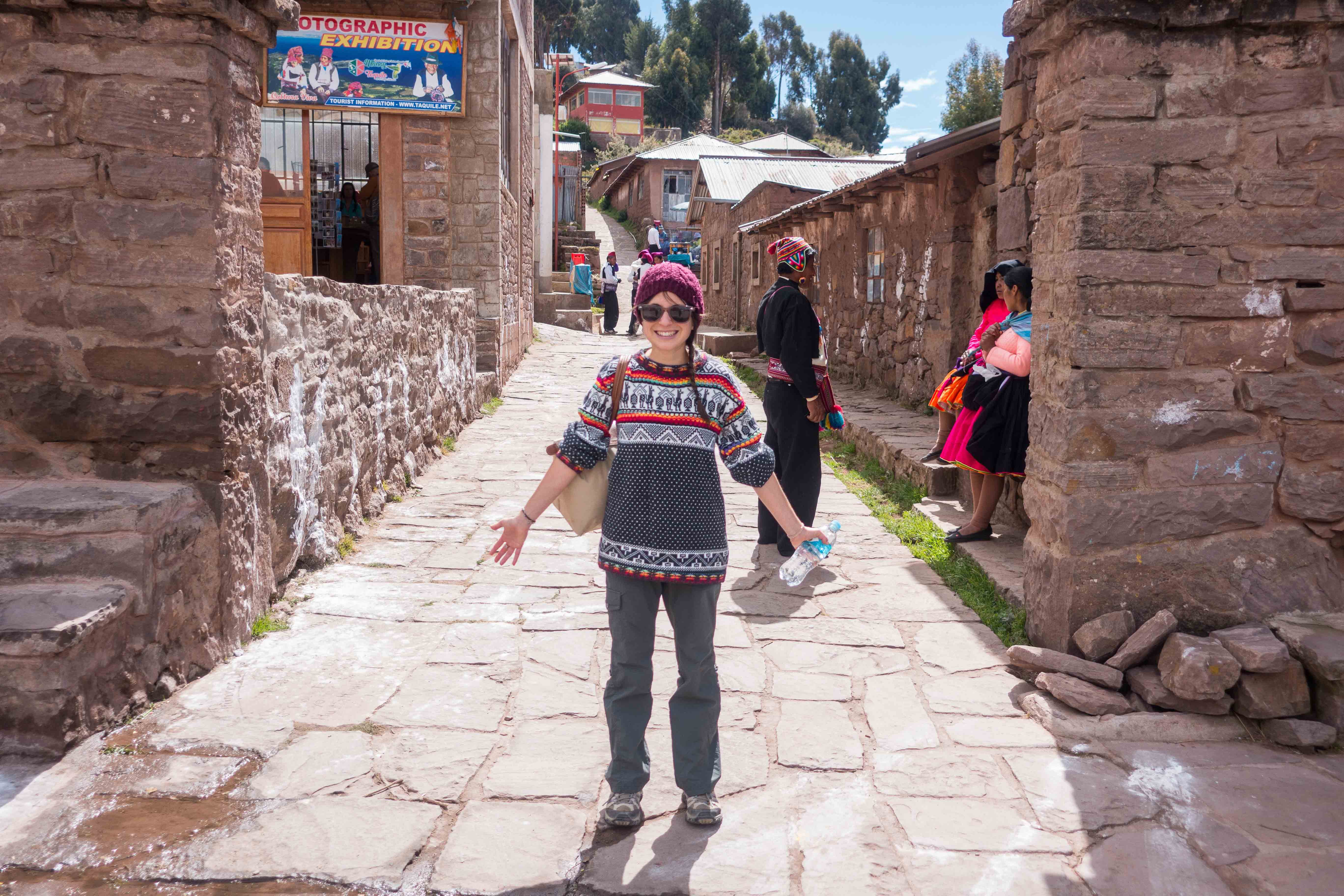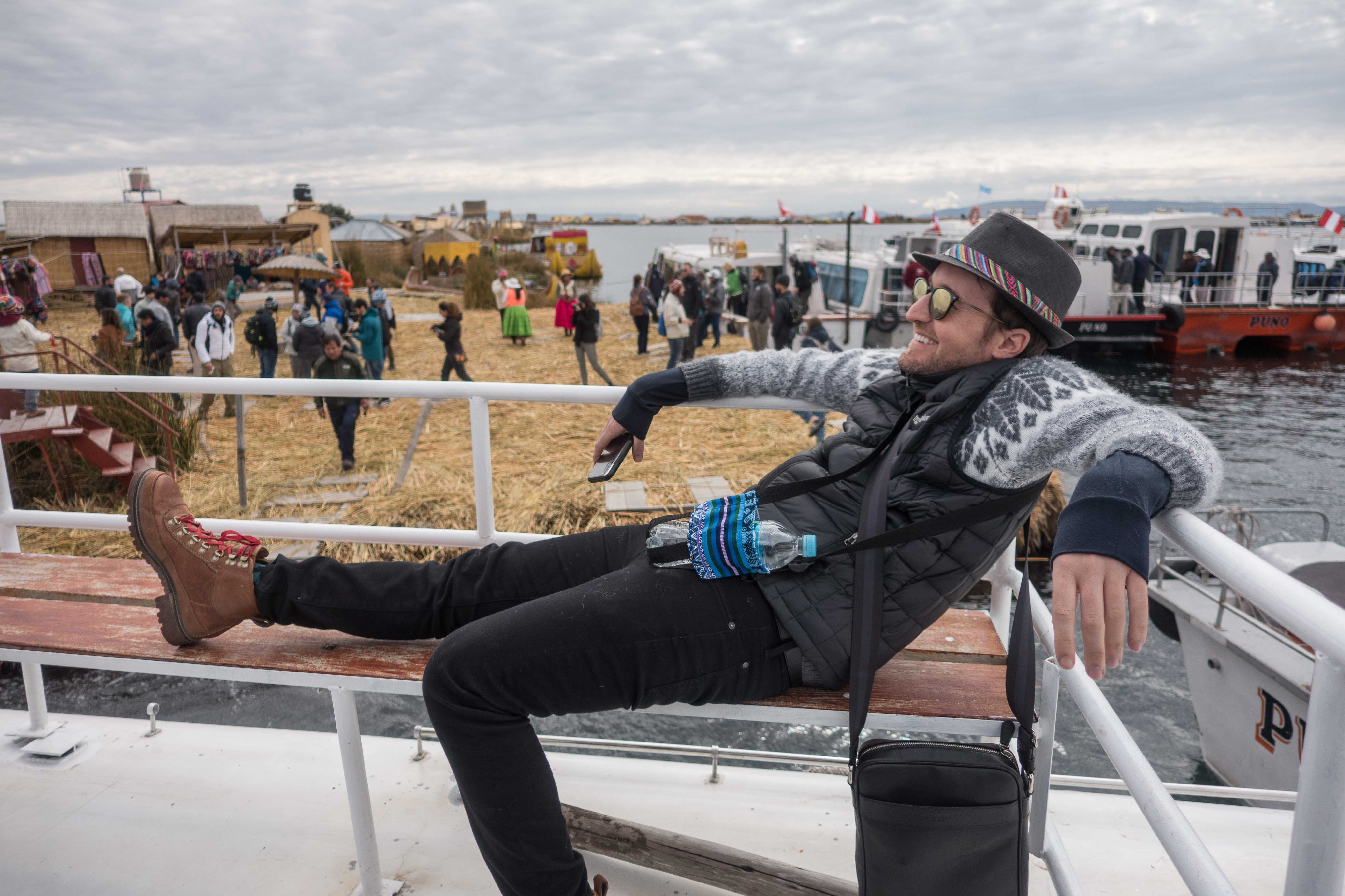 Thomas chilling after boarding the ferry at the tourist trap island! This island is full of souvenir shops, a restaurant and toilets. But it was needed to stop here to get in the ferry that will take us to Taquile Island.