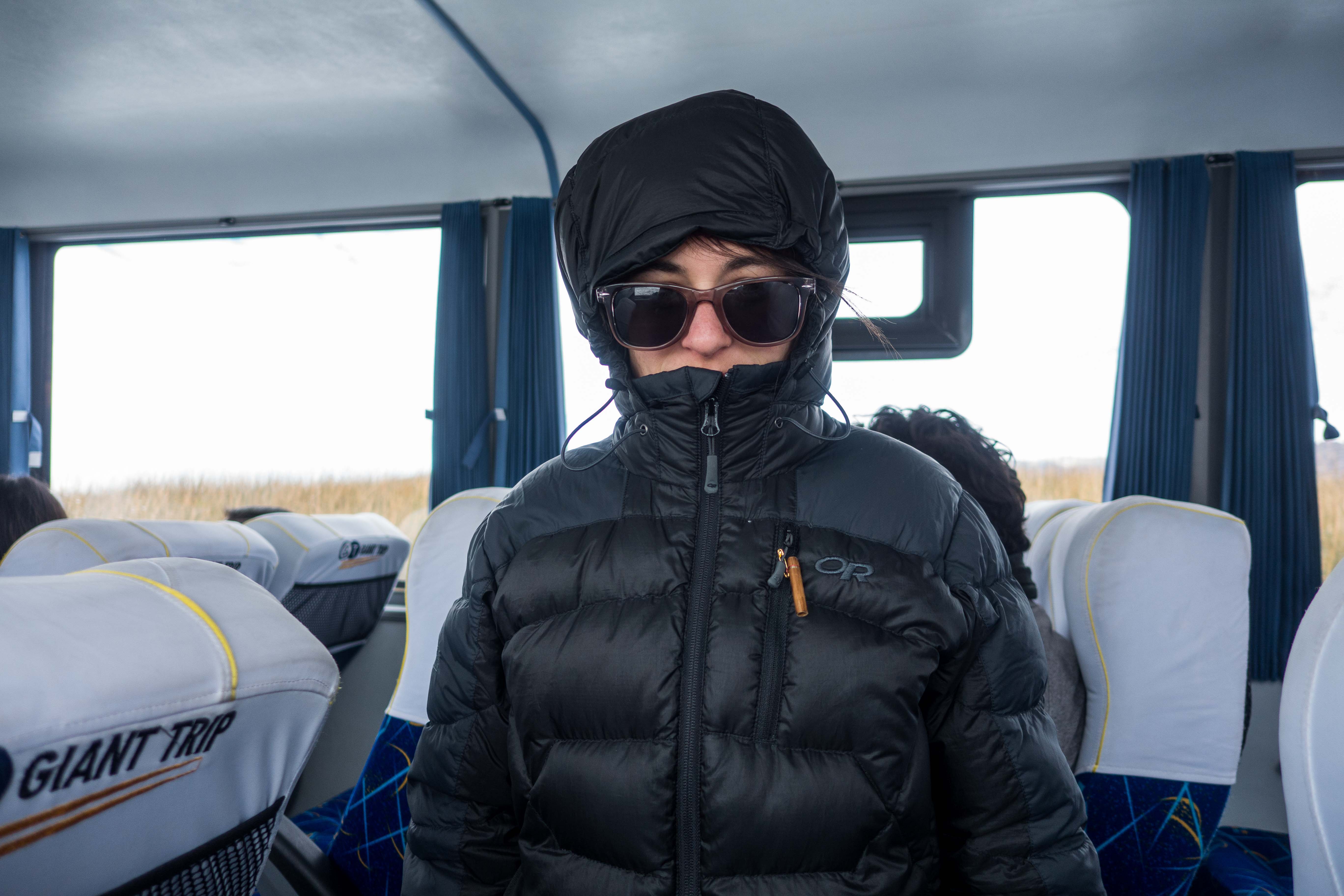 Sarita always overdressed thinking she is traveling in the north pole.