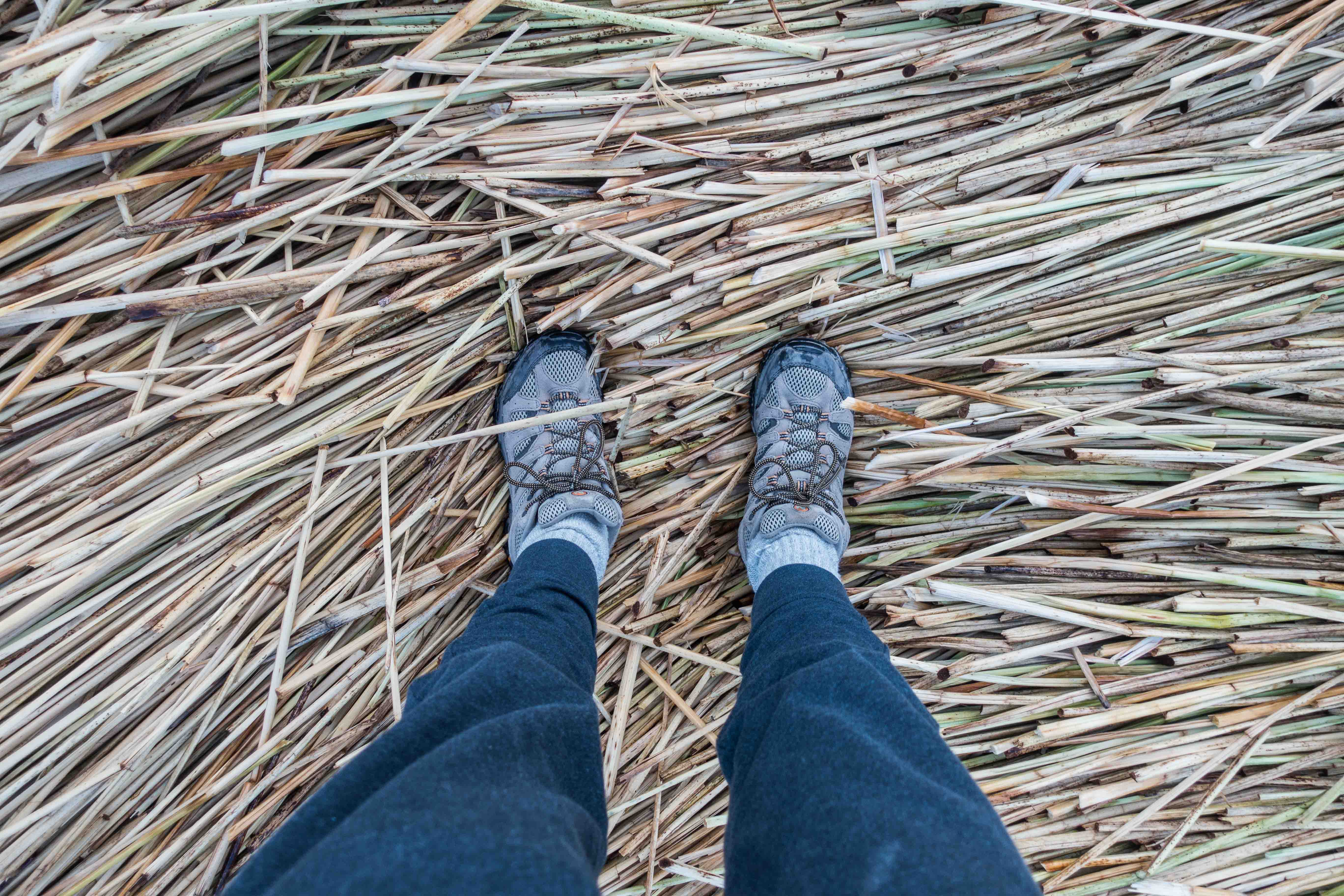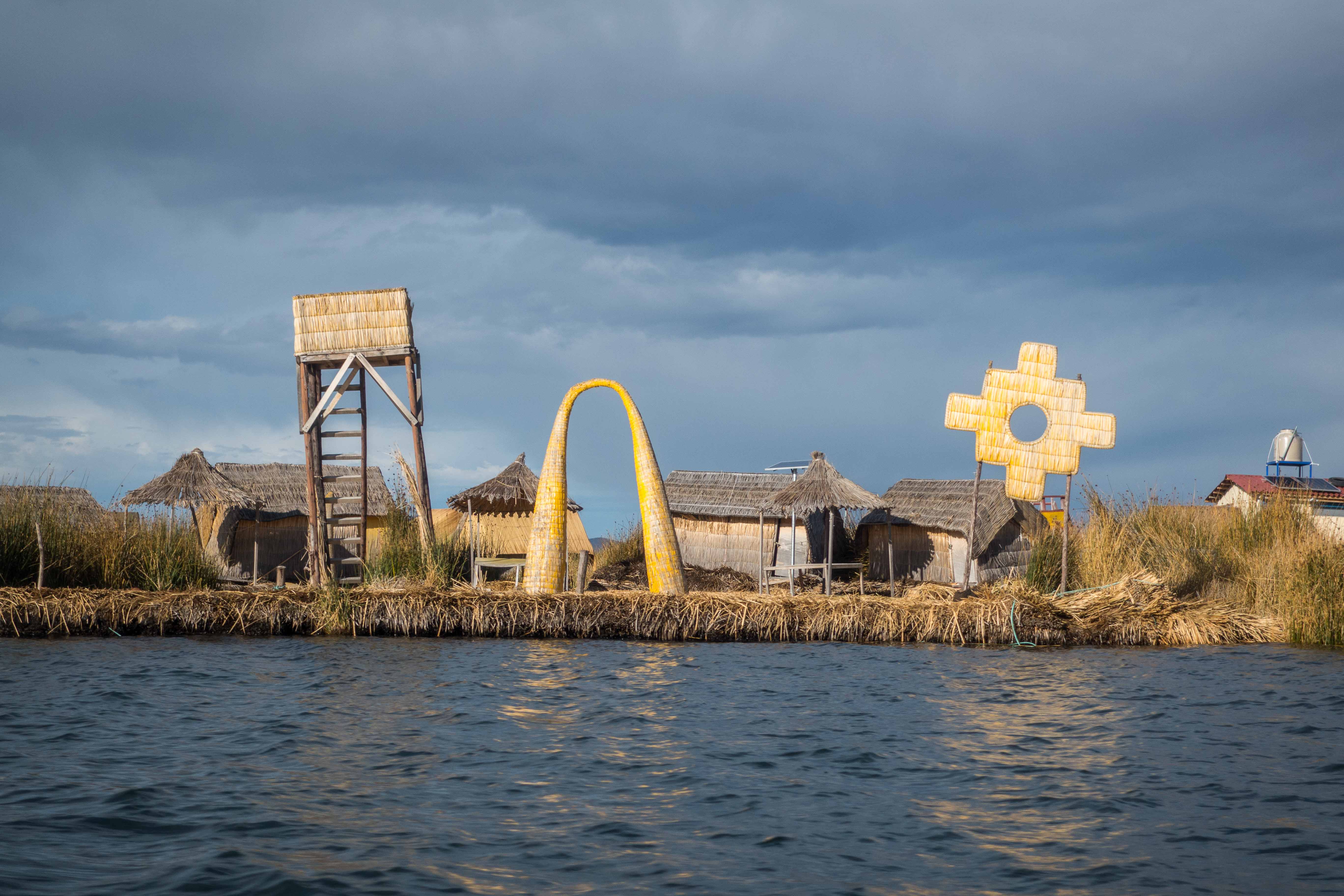 The islets are made of multiple natural layers harvested in Lake Titicaca: The base is made of large pallets of floating Totora roots, which are tied together with ropes and covered in multiple layers of totora reeds. These dense roots that the plants develop and interweave form a natural layer called Khili, which are the main flotation and stability devices of the islands. They are anchored with ropes attached to large Eucalyptus poles driven into the bottom of the lake.