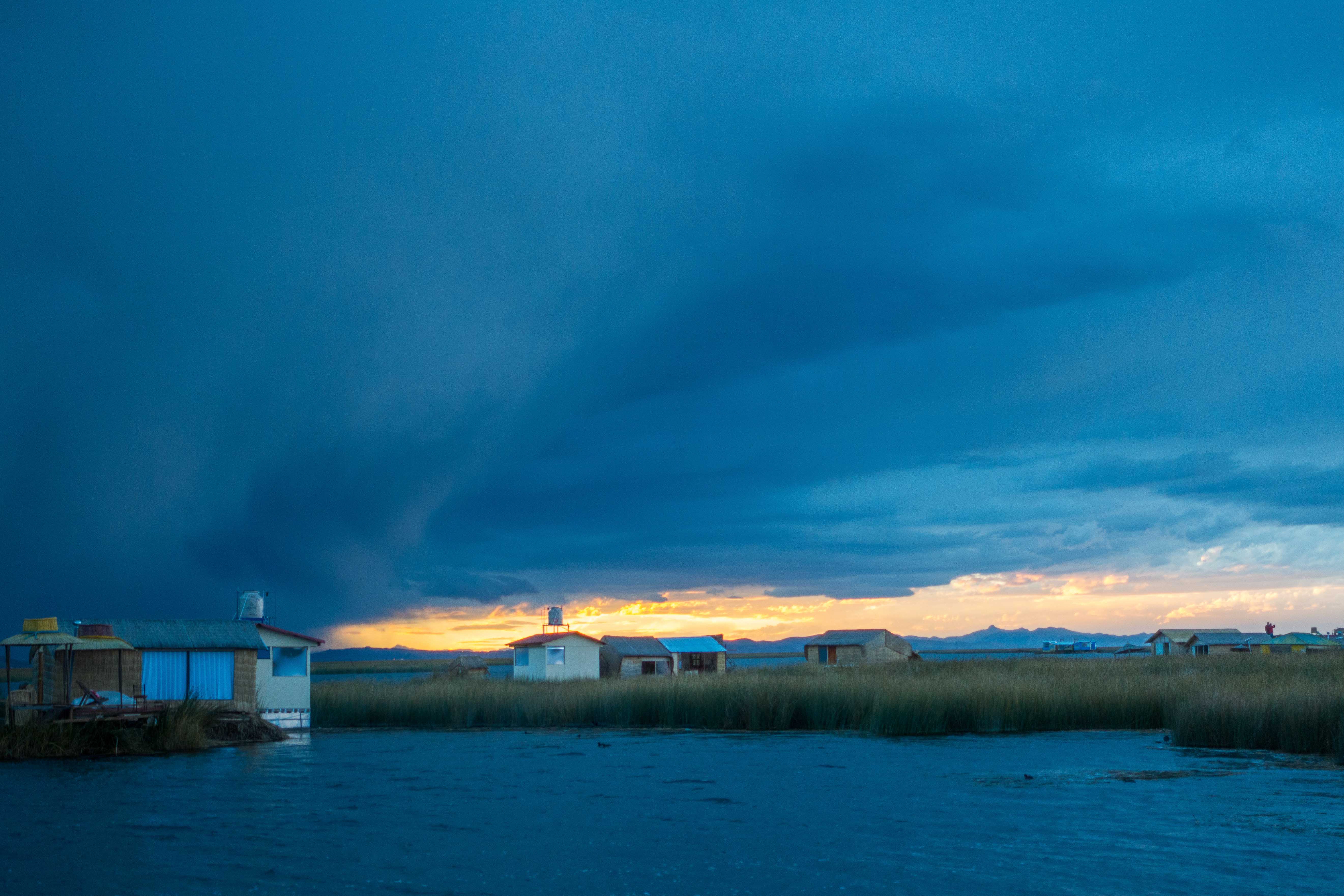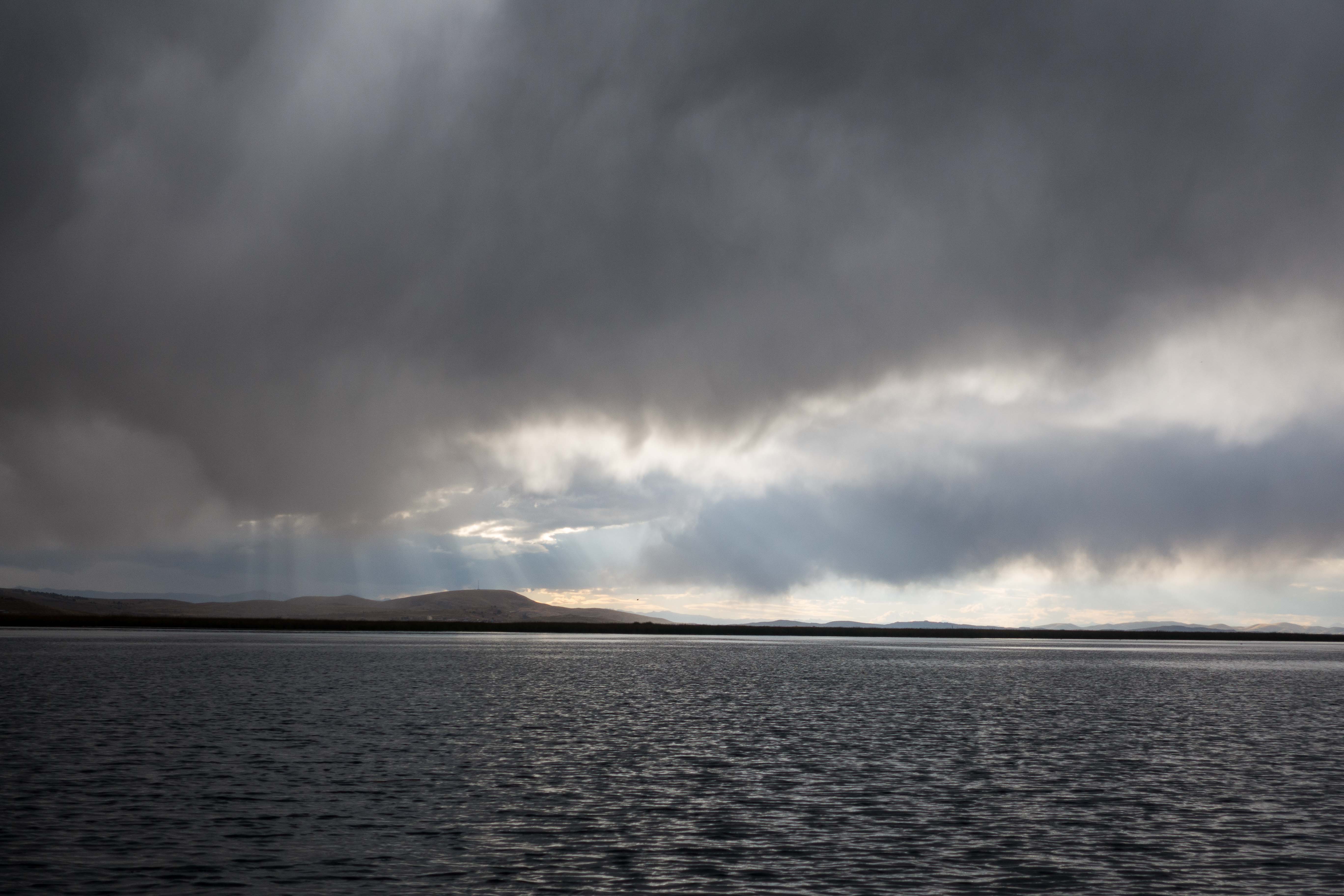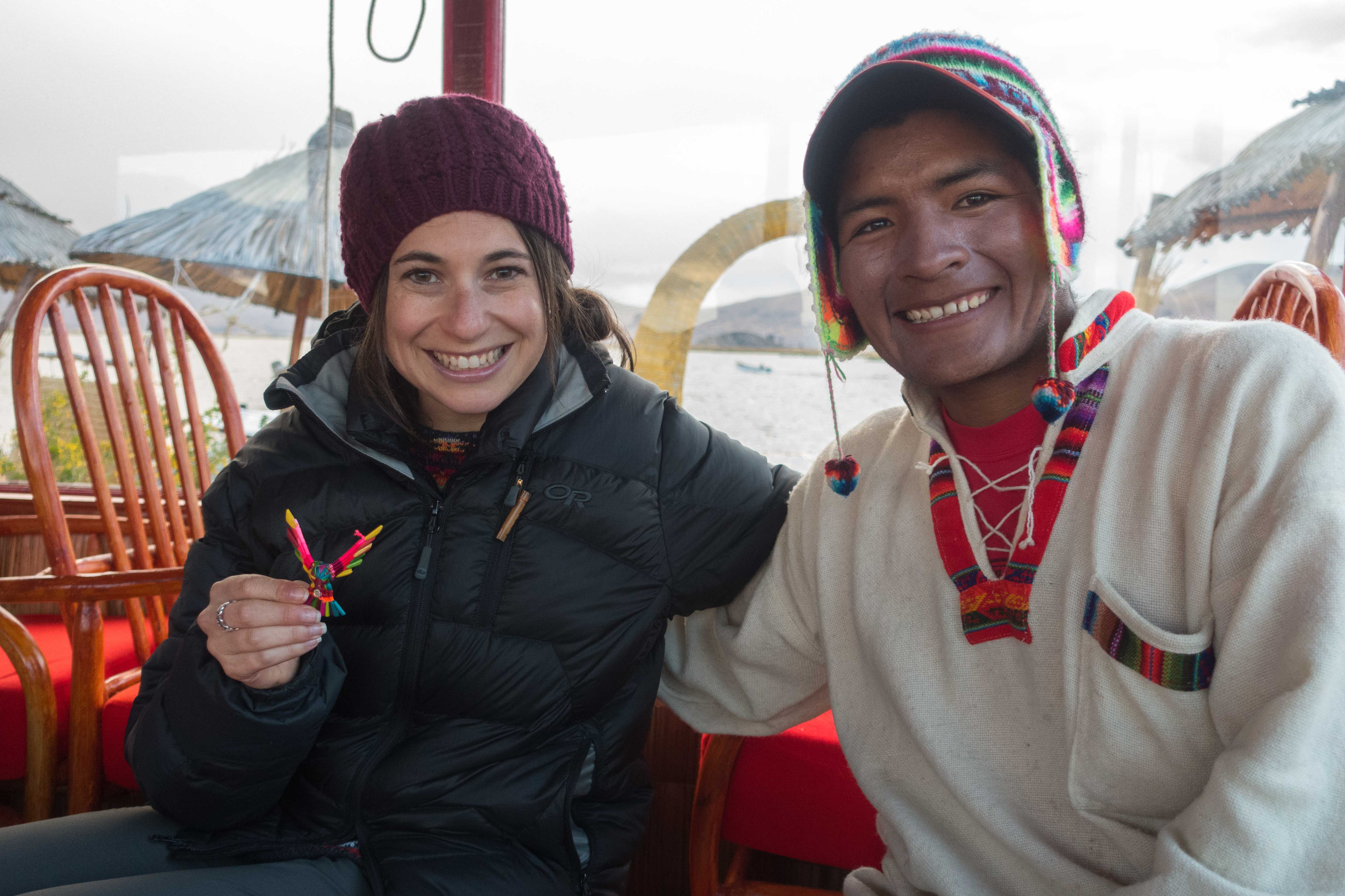 We saw our boat approach and while we were getting on the thunderstorm really took off. We started our 30 min ride on lake Titicaca and the lightning was getting closer and closer and we were getting nervous. The following conversation happened next: