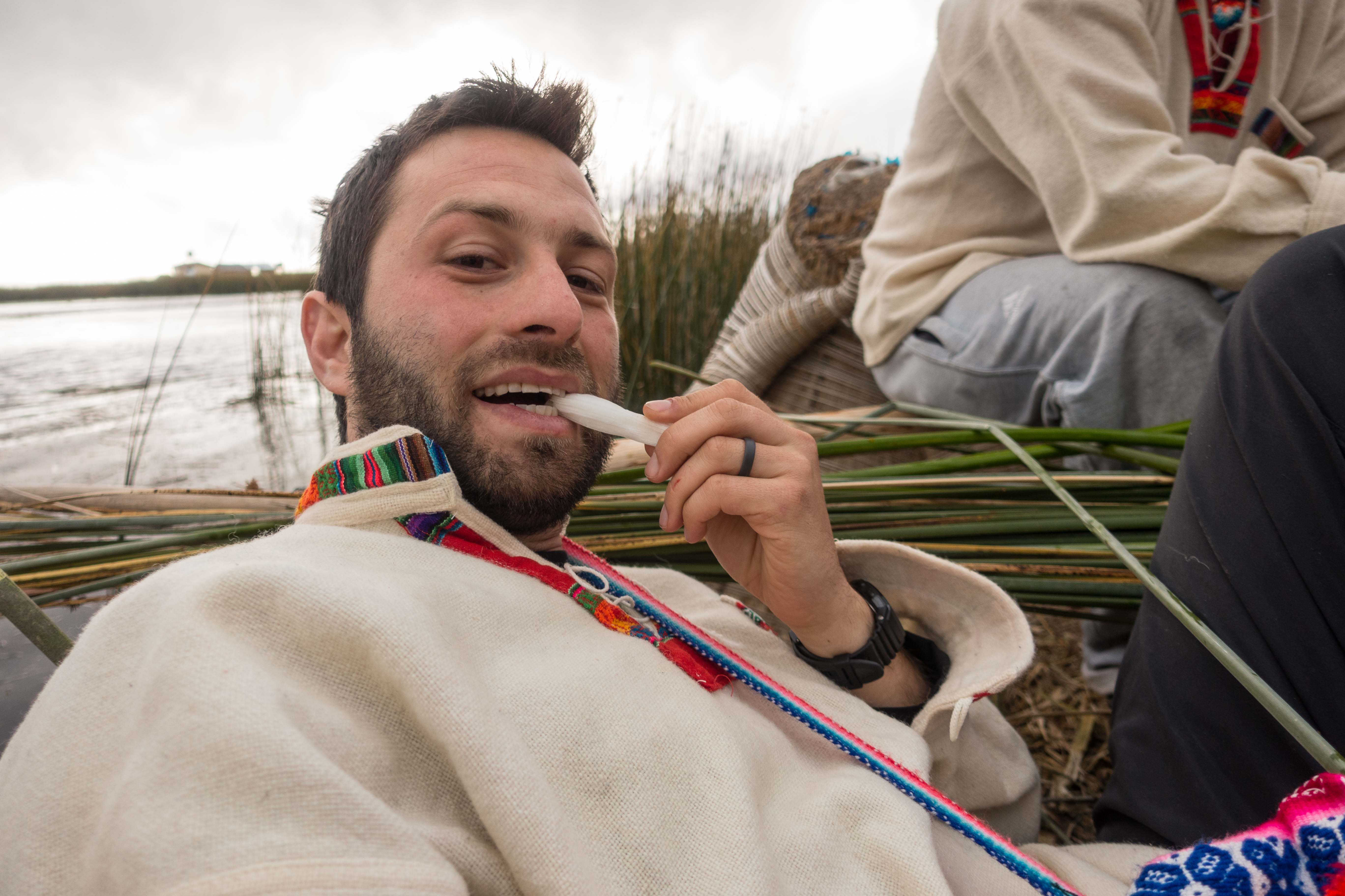 We docked next to the Totora Reeds. He showed us how they cut them and eat them!!