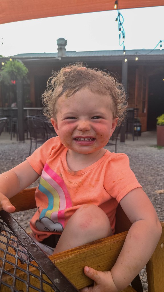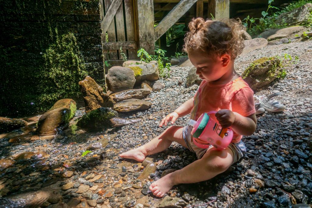 Ariela loved playing with the water below the mill. It was burning hot outside, so it was a nice rest to cool off and recover from the puking episode.