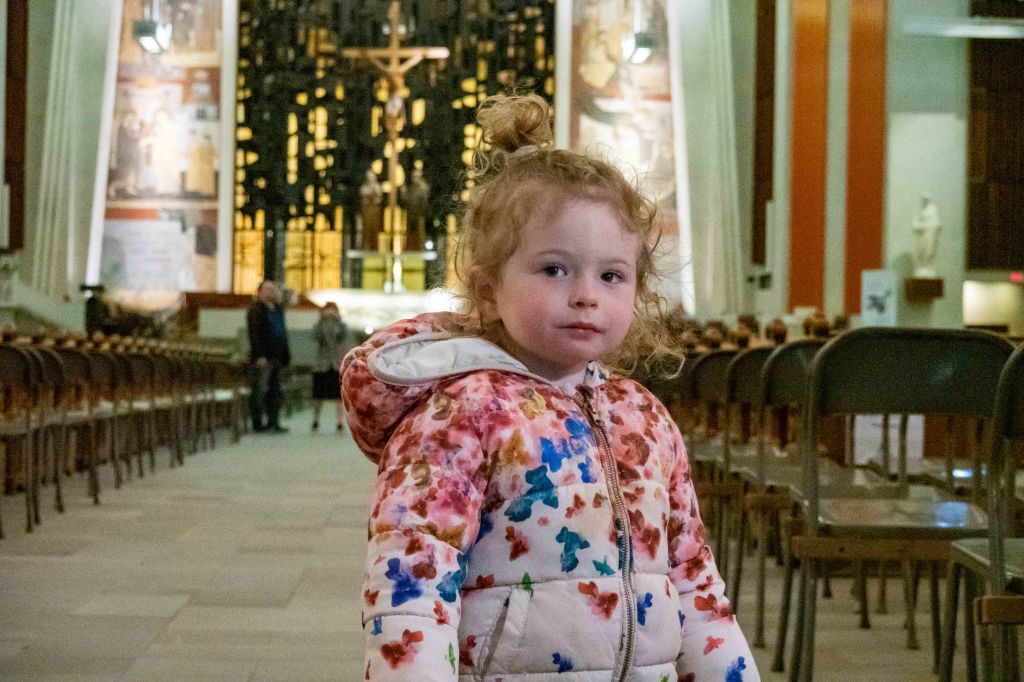 We needed to take a shuttle bus to the top of the mount, where the Oratory entrance was located. Ariela was very excited about the bus.