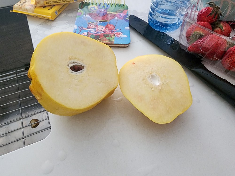 Eitan wanted to try a new fruit called Quince, which is a large pear-like yellow fruit. Unfortunately for him, he did not research that the fruit had to be cooked prior to consumption or it will taste like ass. The first (and last) bite of that fruit was nasty and almost sent Eitan to a shock.
