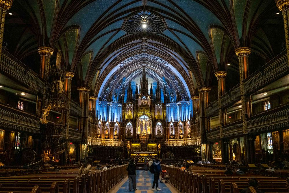 It is filled with hundreds of intricate wooden carvings and several religious statues. Unusual for a church, the stained-glass windows along the walls of the sanctuary do not depict biblical scenes, but rather scenes from the religious history of Montreal.