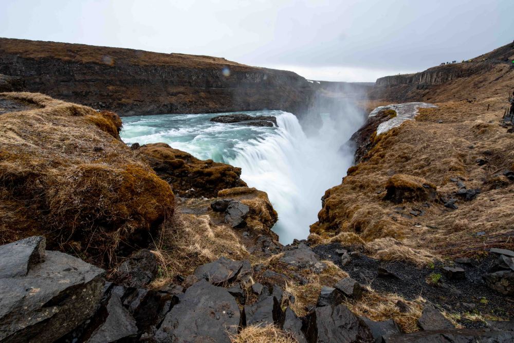 Because of the waterfall’s two stages, Gullfoss should actually be thought of as two separate features. The first, shorter cascade is 11 meters tall (36 feet), whilst the second drop is 21 meters (69 feet). The canyon walls on both sides of the waterfall reach heights of up to 70 meters (230 feet), descending into the great Gullfossgjúfur canyon. Geologists believe that this canyon was formed by glacial outbursts at the beginning of the last ice age.