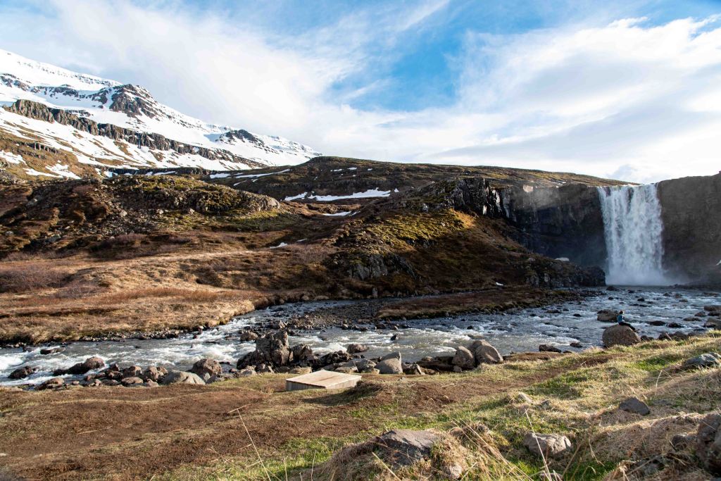 Surrounded by snowcapped mountains and waterfalls, the most prominent natural landmarks are Mt. Bjólfur (1085m) to the west and Strandartindur (1010m) to the east, both of which are a part of Iceland’s seven peak hike.