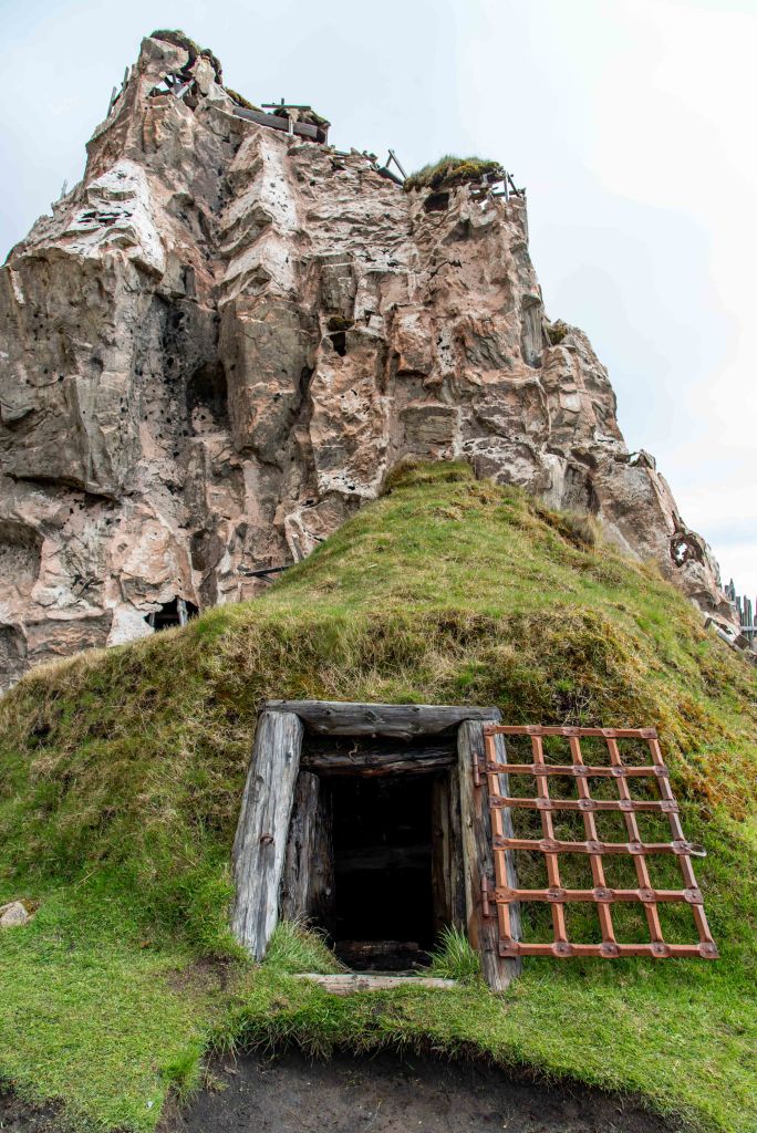 This East Iceland attraction features wooden structures with grass roofs, much like the traditional Icelandic homes called turf houses. These houses have intricately carved door frames with Viking designs and a dungeon set at the base of a constructed boulder.