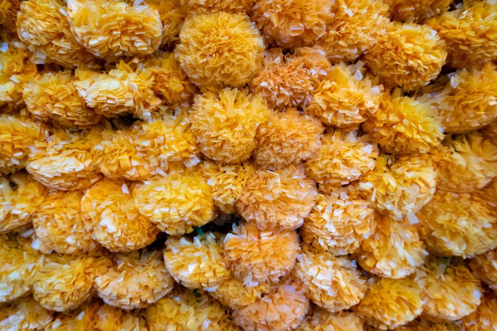Marigold flowers, or cempasúchil, are especially meaningful among Day of the Dead flowers. People believe that they guide spirits back to the living with their bright color and strong fragrance.