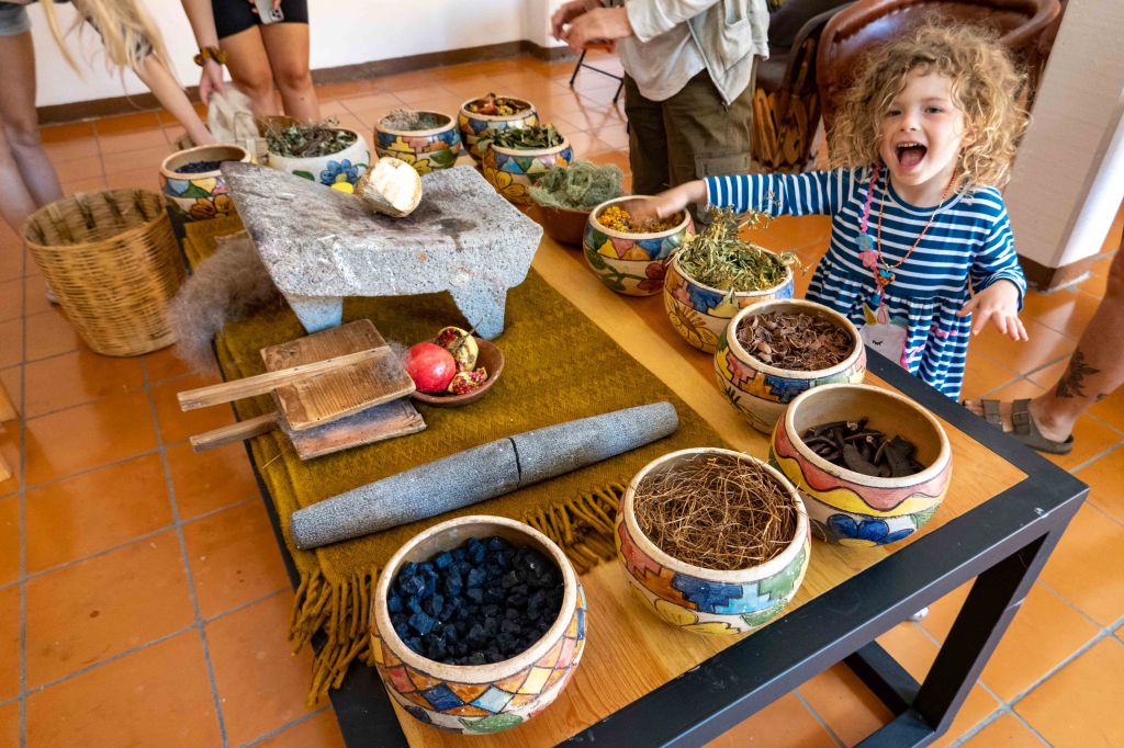 Ariela wanted to touch every color. The dyes are used to color wool and cotton threads for handwoven textiles, such as rugs, rebozos (shawls), and clothing.