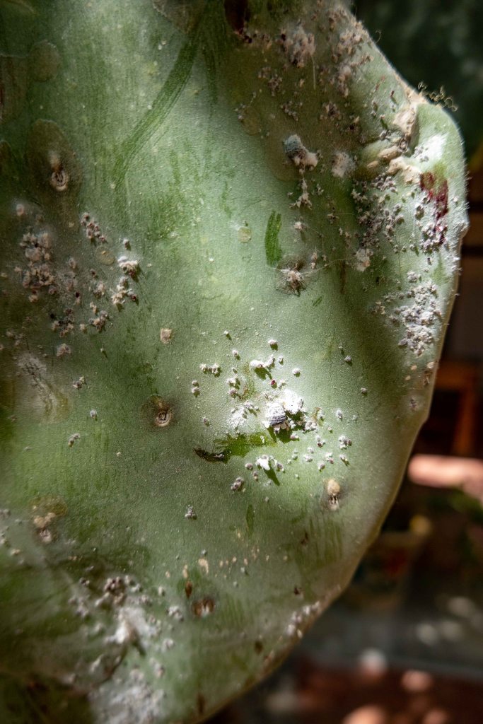 The Carmine color (Between red and magenta) comes from the Cohineal, which is a tiny parasitic insect that lives on the pads of the nopal cactus (prickly pear cactus). You can see it in the picture below as those white small spots protruding from the cactus.