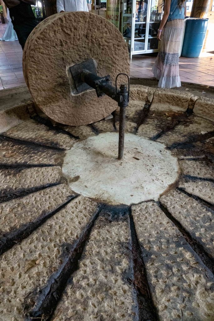 The roasted piñas are crushed by a large stone wheel called a tahona, pulled by animals (like oxen) or machinery.